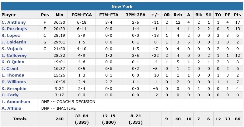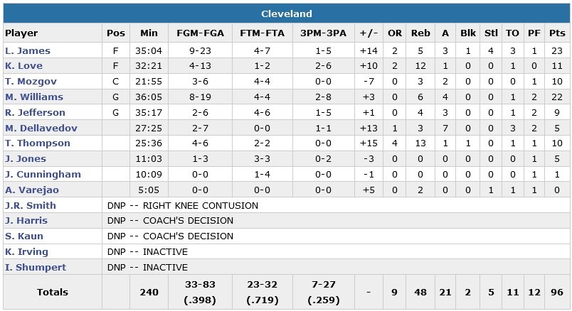 Menés de 15 points dans le premier quart-temps (les Knicks démarrent sur un 13/21 aux tirs), Cleveland devra attendre la fin du troisième pour repasser devant sur une passe décisive de Matthew Dellavedova pour un dunk de Thomspon, 70-69. James, énervé par les manches de son maillot en première mi-temps, boucle ainsi un 12-4 en faveur des siens à 3-points (seulement son deuxième tir primé de la saison !) pour donner 8 points d’avance à Cleveland à 4’01, 87-79. Langston Galloway (12 points) réduit l’écart derrière la ligne mais après un nouveau dunk du King, Kevin Love s’occupe de tuer le match de loin à 1’41, 96-82.