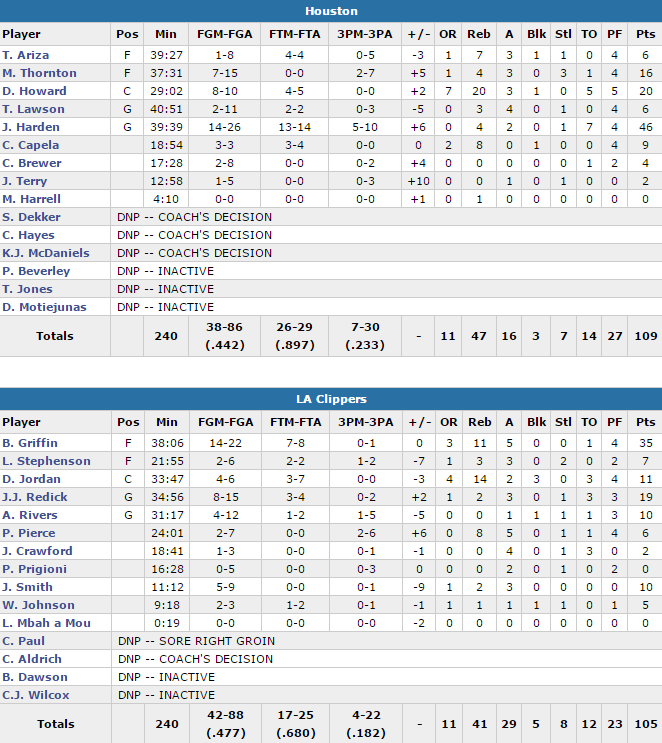 Les débats de sont équilibrés après la pause, aucune équipe ne réussissant à faire le break jusqu’à une nouvelle fois une grosse fin de quart des Texans. Harden a inscrit à lui tout seul un 8-0 en 45 secondes pour mettre Houston en bonne position à l’entame des 12 dernières minutes 83-78. Harden, Thornton et Howard ont enfoncé le clou et à 6 minutes de la fin on pensait le match plié avec un matelas de 11 points pour les joueurs de Kevin McHale. C’est le moment choisi par les Clippers pour passer un 17-6 dans le sillage de Blake Griffin et JJ Redick et égaliser à 105-105 sur un trois points de Paul Pierce à seulement 41 secondes de la fin. Mais les Clippers ont mal géré leur fin de rencontre, Griffin, Pierce et Crawford ont manqué leur tentative et c’est sur la ligne des lancers que Houston a plié ça. Sur la tentative de Griffin pour passer devant, les Clippers auraient dû bénéficier d’un nettoyage de cercle irrégulier d’Howard, mais les arbitres en ont décidé autrement.