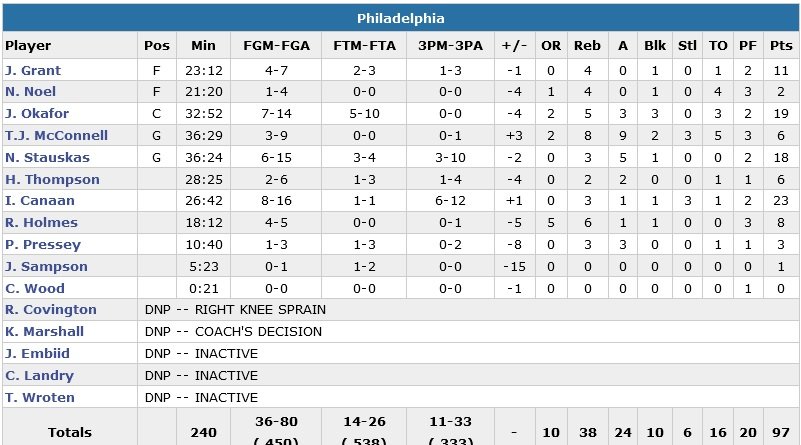 En l’absence de Nikola Vucevic (contusion au genou), Dewayne Dedmon continue à faire bonne impression avec 12 points, 9 rebonds et 3 contres. Pour les Sixers, qui n’ont toujours pas gagné cette saison, il s’agit d’une 6e défaite consécutive. Isaiah Canaan termine meilleur marqueur de Phila avec 23 points à 6/12 de loin, Jahlil Okafor ajoute 19 points, Nik Stauskas 18 et T.J. McConnell 9 passes et 8 rebonds mais ce ne fut pas encore suffisant pour des Sixers qui se laissent rapidement submerger en début de match avant de faire jeu égal avec le Magic tout au long de la rencontre.