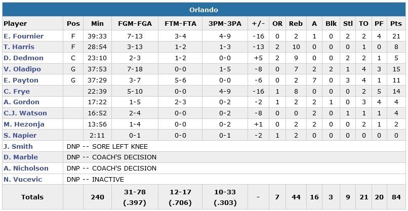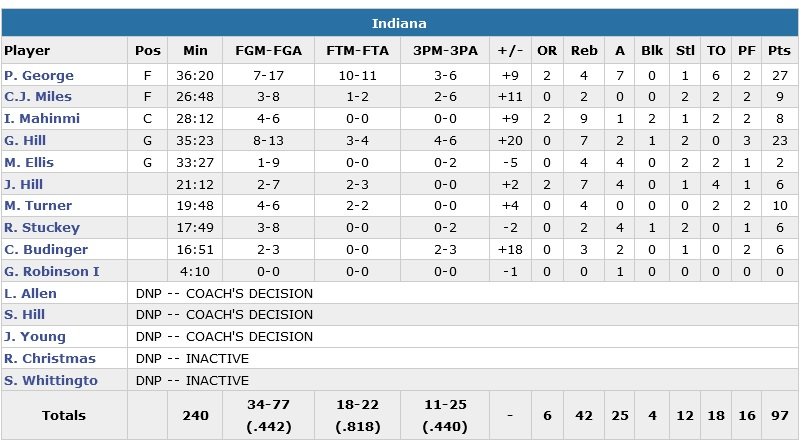 Indiana se détache 77-72 sur un 3-points de Chase Budinger à 9’26, Fournier redonne l’avantage aux siens lui aussi de loin et Channing Frye ajoute deux points, 81-78 à 7’51. George prend alors les commandes avec un 3-points (83-81) et son équipe passe un 17-3 fatal aux hommes de Scott Skiles. Après ce panier, Budinger enchaîne sur un nouveau tir primé avant un drive de George Hill (23 points, 7 rebonds) pour sceller l’affaire, 88-81.