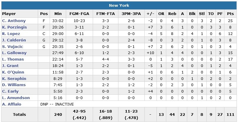 À noter : Anthony ne marque que 2 points dans le premier quart-temps, puis 17 dans le second afin de donner 8 points d’avance aux Knicks à la pause, 60-52.