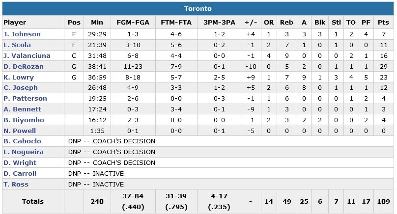 Malgré 29 points de DeMar DeRozan (11/23) et 23 points (8/18), 7 rebonds et 9 passes de Kyle Lowry, Toronto s’incline pour la première fois de la saison à l’Air Canada Centre. La faute à un Carmelo Anthony à 25 points à 10/23 bien suppléé par son banc et un large avantage aux shoots longue distance pour New York (11/23 pour les hommes de Derek Fisher contre 4/17 pour ceux de Dwane Casey). Les remplaçants des Knicks inscrivent pas moins de 54 points dans cette rencontre (dont 17 de Lance Thomas et 15 de Langston Galloway), contre seulement 23 pour les locaux.