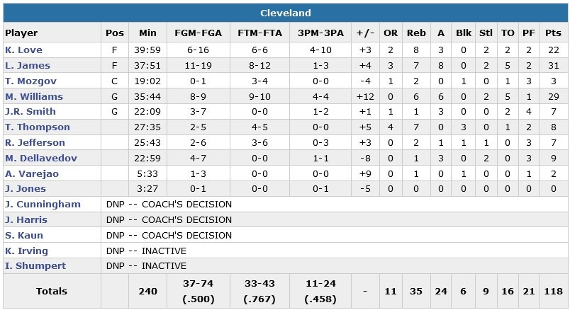 À noter : Love s’est tordu la cheville gauche dans le troisième quart-temps après une tentative de dunk mais est finalement revenu en jeu après un temps-mort. Cleveland a commis 16 pertes de balles qui se sont traduites en 29 points pour ses adversaires. Rudy Gobert s’est lui aussi blessé à la cheville en fin de match et il termine à 15 points à 6/10, 7 rebonds et 5 passes mais n’a pas enregistré un seul contre.
