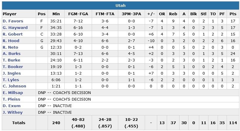 En milieu de quatrième quart-temps, le match est encore à l’avantage d’Utah, 95-86, avant que LeBron James ne s’énerve. Un 8-0 lancé par Love à 3-points et poursuivi par 5 points consécutifs de James permet aux Cavaliers de revenir à un point, 95-94. Rodney Hood (16 points) répond avec un tir primé mais son équipe encaisse cette fois un 10-0 et Cleveland prend 6 points d’avance 104-98 à 2’57 de la fin du match. Utah s’accroche grâce à un duo Gordon Hayward (17 points)- Alec Burks (24 points) agressif mais au petit jeu des lancers-francs, Mo Williams met tout le monde à l’amende.