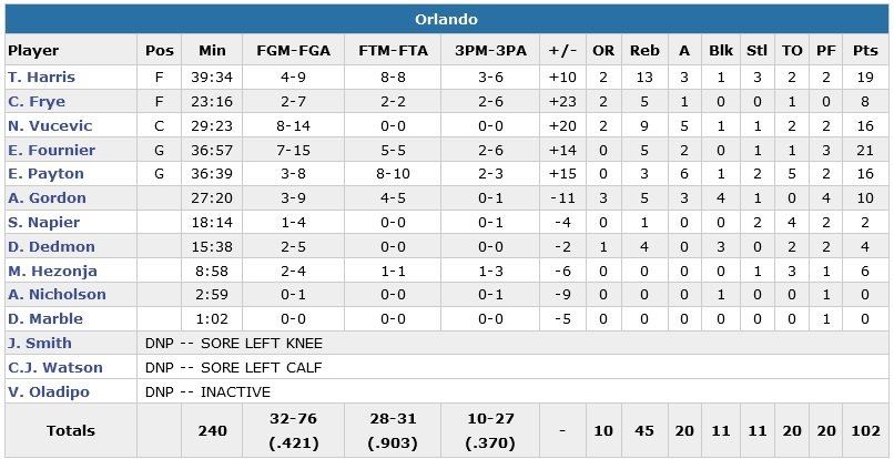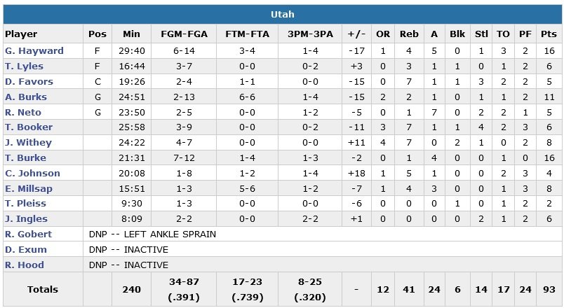 Gordon Hayward, seul joueur du cinq à rentrer un shoot dans le jeu en première mi-temps (!) et Trey Burke marquent 16 points en l’absence de de Victor Oladipo (commotion cérébrale) mais Fournier marque 13 de ses 21 points en première mi-temps. Scott Skiles se permet d’ouvrir son banc à 94-71 et 7’25 à jouer mais le Jazz passe un 11-2 initié par ses remplaçants et le coach du Magic rappelle rapidement, Fournier, Harris, Nikola Vucevic et Elfrid Payton sur le parquet à 2’52 de la fin du match.