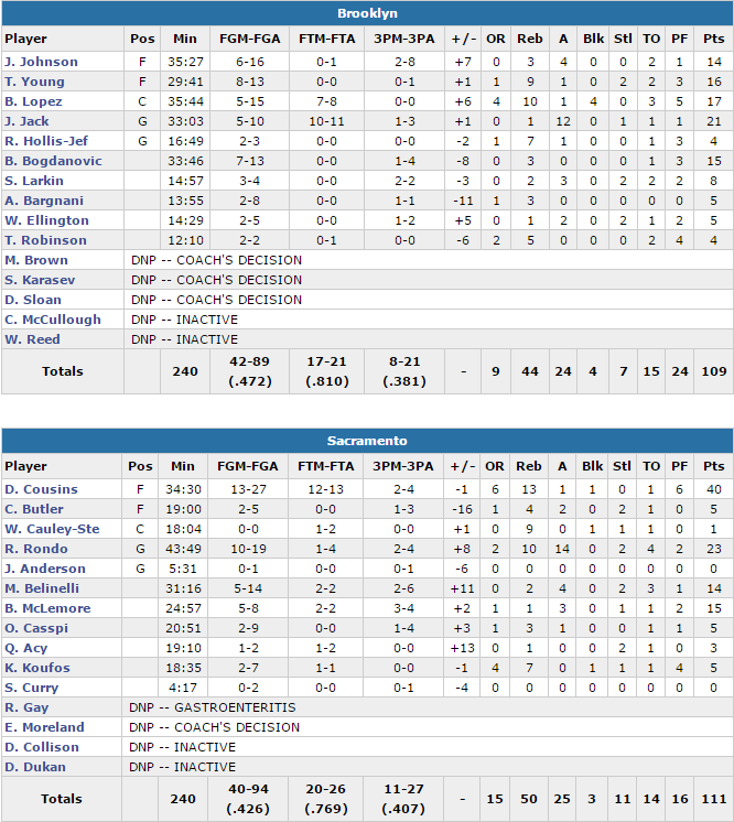Andrea Bargnani a remis les Nets en bonne position en marquant les 5 premiers points, mais Sacramento a rapidement repris sa marche en avant. Rondo et Belinelli ont une nouvelle fois participé à une série importante en inscrivant les 10 premiers points d’un 12-2 pour donner un avantage de 8 points. A 3 minutes du terme l’avance était confortable pour Sacramento avec un plus 9, mais ces derniers ont réussi à se faire peur, très peu même. Joe Johnson par deux fois à trois points, avec l’aide de Wayne Ellington, a réduit l’écart à 2 points à 21.6 secondes de la fin mais McLemore n’a pas craqué aux lancers et Sacramento s’en est finalement sorti malgré 2 lancers ratés de Rondo.