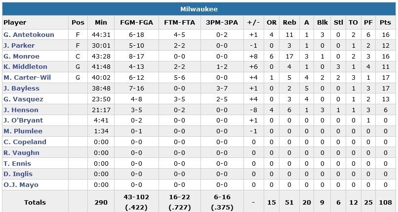 Comme Bayless, Michael Carter-Williams signe 17 points, alors que Giannis Antetokounmpo (qui défendait sur James avant de sortir pour 6 fautes à 3’15 de la fin de la deuxième prolongation) et Greg Monroe sont partout dans la raquette avec respectivement 16 points et 11 rebonds et 16 points et 17 rebonds pour Milwaukee.