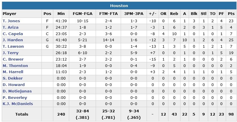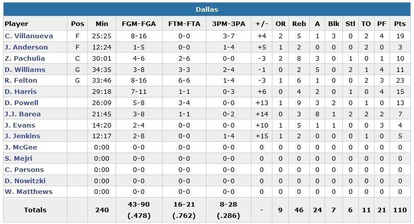 Sans Dwight Howard (repos, le bilan de son équipe sans lui est de une victoire pour trois défaites), James Harden termine avec 25 points à 5/21, 10 passes et 7 rebonds dans le derby, accompagné par les 23 points à 10/15, 6 rebonds et 3 contres de Terrence Jones. Battus 4-1 au premier tour des playoffs par cette même équipe en avril dernier, les Mavericks profitent de la bien faible défense adverse pour marquer 57 points en première mi-temps. Le match prendra des allures de correction alors que les joueurs de Rick Carlisle mèneront de jusqu’à 26 points avant la réaction adverse.