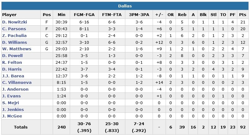 Le score reste serré avant que Nowitzki ne prenne le contrôle dans le money time. À 4 minutes et 23 secondes du buzzer, les Mavericks ne mènent ainsi que d’un point, 82-81. L’Allemand score 7 des 9 points d’un 9-2 en faveur des siens pendant les 2’36 qui vont suivre et boucle la série sur un 3-points qui redonne 6 points d’avance à Dallas à 1’47, l’écart est désormais trop grand pour Philadelphie (devenue la première équipe de l’histoire à démarrer par un 0V-11D deux saisons de suite).