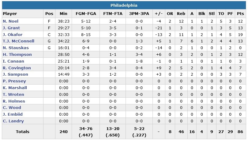 Philadelphie, qui n’a plus gagné le moindre match depuis le 25 mars dernier à Denver, a une nouvelle fois été porté par un Jahlil Okafor (19 points et 11 rebonds) entouré de 4 joueurs du 5 majeur à au moins 10 points. Les Sixers shootent mieux que leurs adversaires (44.7% à 39.5%), prennent plus de rebonds (46-39) et font autant de passes. Seul problème et il est de taille : 27 ballons perdus à « seulement » 19 pour Dallas.