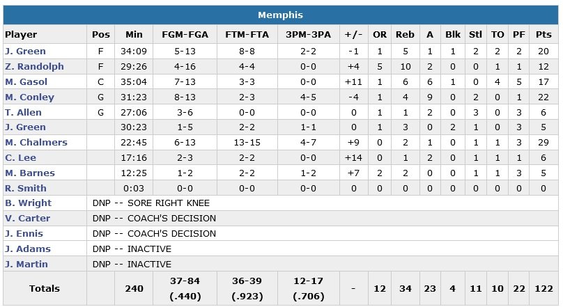 Mike Conley ajoute 22 points, Jeff Green 20, Marc Gasol 17 et Zach Randolph 12 points et 10 rebonds. En face Russell Westbrook marque 40 points à 13/19 dont 12 dans le dernier quart et distribue 14 passes décisives en 38 minutes. Le meneur a tout tenté pour rattraper les 11 points de retard de son équipe. Serge Ibaka ajoute 18 points, Enes Kanter 16, Steven Adams et Dion Waiters 14 chacun.
