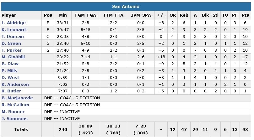 8e victoire en 9 matchs et 5e succès de rang (93-80) pour les Spurs, opposés à Portland cette nuit. Kawhi Leonard mène la danse avec 19 pts, Manu Ginobili suit avec 17 pts puis Danny Green et Boris Diaw (12 pts), Tony Parker et Tim Duncan (10 pts) viennent ajouter leur grain de sel.