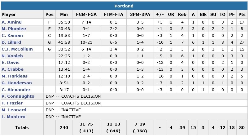 LaMarcus Aldridge a lui eu un peu plus de mal avec seulement 6 points à 2/8 et 6 rebonds en 33 minutes. Son ancien coéquipier Damian Lillard termine meilleur marqueur des Blazers avec 27 points, épaulé par les 17 unités d’Al-Farouq Aminu. La première mi-temps est une petite catastrophe offensive pour les deux équipes, qui inscrivent 64 points (28 pour Portland, 36 pour San Antonio) à elles deux. Dans le premier quart-temps, on assiste à un carnage avec un 27% combiné. Mais comme souvent, le jeu des passes des Texans a fait la différence (29 passes à 15).