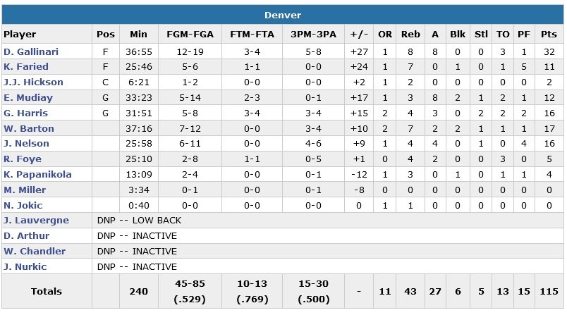 Les Nuggets terminent à 52.9% aux tirs, pas loin de leurs adversaires (49.4%) qui manqueront néanmoins 16 de leurs 23 tentatives lointaines… La star italienne de l’équipe marque 15 points dans le troisième quart-temps, permettant aux siens de transformer un déficit de deux points à la pause en avantage de 11 en fin de période.