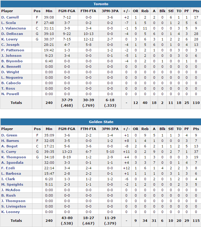 Une nouvelle fois les Warriors se sont appuyés sur un grand Stephen Curry, auteur de 37 points à 13/23 dont 5/10 à trois points, 9 passes, 2 interceptions et 7 ballons perdus. Klay Thompson était de retour et signe 19 points, tandis qu’Andrew Bogut en ajoute 13 et Draymond Green compile 9 points, 9 rebonds et 5 passes. Les Californiens pensaient avoir fait le plus dur dans une très bonne première mi-temps où ils ont mis la tête sous l’eau aux Raptors dans les dernières minutes. Alors que Toronto s’accrochait parfaitement grâce à son duo Kyle Lowry (28 points à 7/15) – DeMar DeRozan (28 points à 9/22) et que l’avance des Warriors était de seulement 3 points à 5’50 de la mi-temps, les champions ont passé un 22-6 sous l’impulsion des Splash Brothers, déchaînés. A la pause Golden State était tranquillement en tête 63-47.