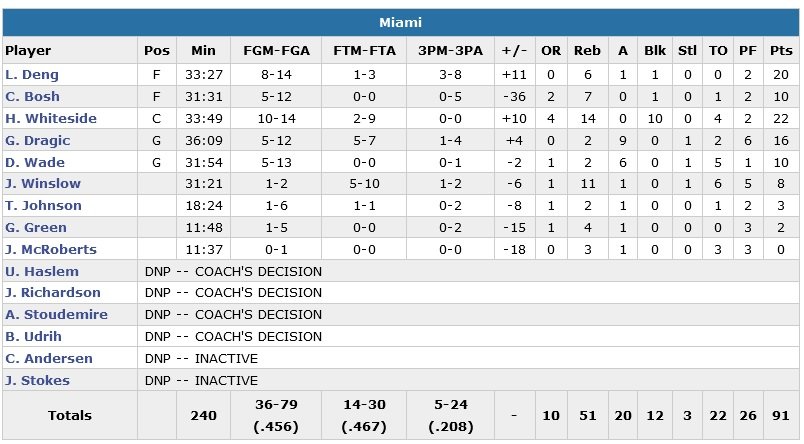 Grosse force de Miami sur ses 10 premiers matchs, le banc a été complètement dominé dans ce match. Les remplaçants adverses inscrivent ainsi 54 points contre seulement 13 pour Justise Winslow, Tyler Johnson, Josh McRoberts et Gerald Green (qui a joué pour la première fois depuis le 1er novembre), qui combinent pour un pauvre 3/14.