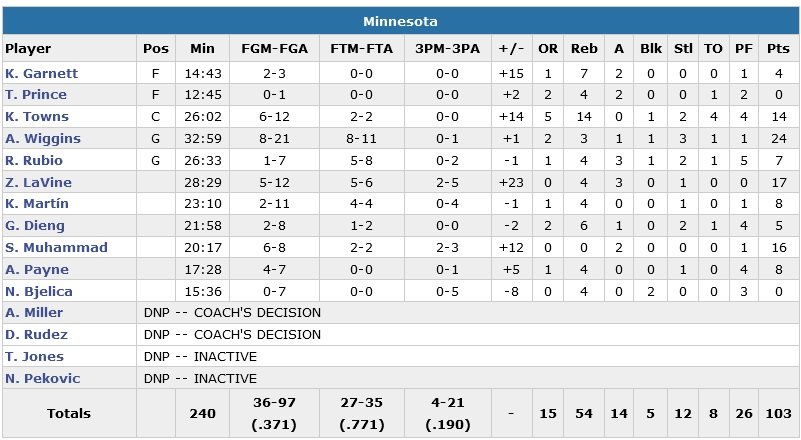 Ses coéquipiers n’ont pas été capables de relever le défi avec un 5/24 à 3-points (Minnesota fait encore pire avec un magnifique 4/21), 14/30 aux lancers-francs pour l’équipe et 22 pertes de balles (contre seulement 8 pour les Timberwolves) pour cette première défaite en quatre matchs pour Miami. De retour dans le cinq majeur après quatre matchs manqués, Ricky Rubio (ischio) termine à 7 points à 1/7, 4 rebonds et 3 passes en 26 minutes. Les Wolves ont au passage stoppé la série de 7 matchs à moins de 100 points pour les adversaires du Heat.