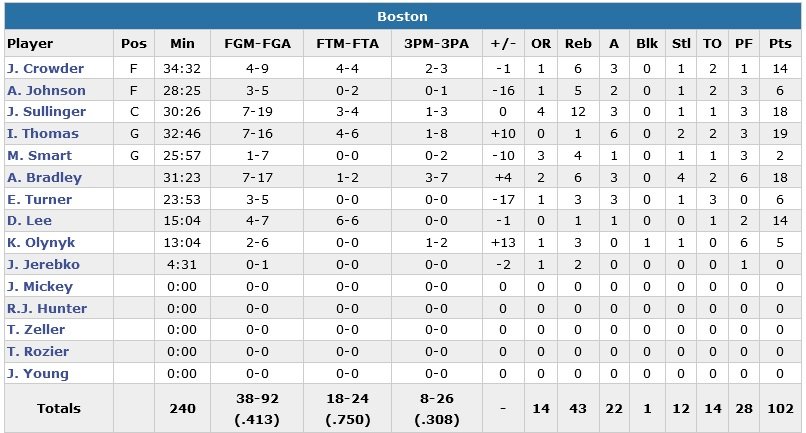 Les Mavericks remportent une 5e victoire consécutive, mettant au passage fin à la série de 3 victoires des Celtics, menés par les 19 points d’Isaiah Thomas, 18 points et 12 rebonds de Jared Sullinger et 18 points d’Avery Bradley. Ce dernier est très chaud en début de match avec 12 points marqués en 1 minute et 43 secondes durant un 18-3 qui permet à Boston de largement mener 31-16 après un quart-temps.