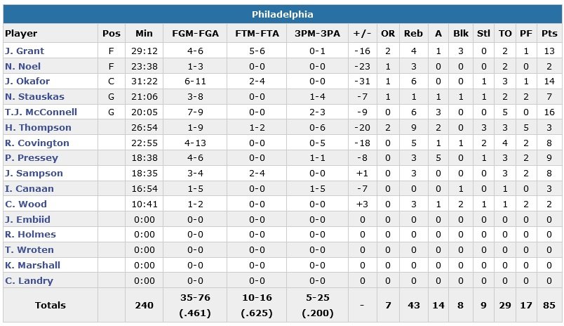 Battus pour la 12e fois de la saison par les Pacers de Paul George (34 points à 13/24, 8 rebonds, 5 passes, 4 interceptions) et C.J. Miles (20 points à 7/12, 4 passes) sur le score de 112-85, les 76ers ne sont plus qu’à 5 défaites de matcher leur pire départ de l’histoire datant de l’année dernière…