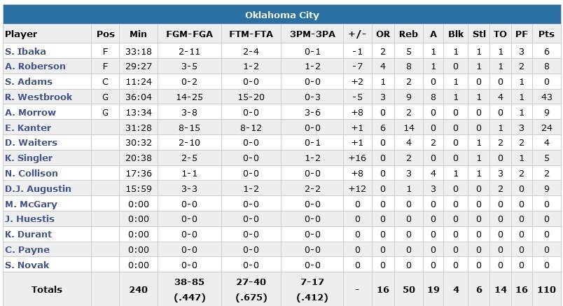 L’équipe d’Alvin Gentry va dans un premier temps profiter du faible départ de ses adversaires et prend jusqu’à 9 points d’avance dans le deuxième quart-temps, 30-21. Mais sur les 11 dernières minutes de la période, OKC reprend le contrôle avec un 32-15 et mène bientôt 53-45. L’écart atteindra les 13 points dans le troisième quart-temps mais l’avance ne sera que de 6 points, 80-74 pour les hommes de Billy Donovan avant le 4e quart.