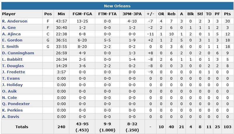 Les Pelicans manqueront deux fois une occasion d’égaliser en début de période, Toney Douglas et Anderson ratant leur cible à 3-points. À 3’24 de la fin du match, le Thunder passe d’une avance 97-94 à un +8, 102-94 moins d’une minute plus tard grâce à un 2+1 et un layup signé Westbrook. Ce dernier inscrit 12 des 15 derniers points de son équipe et boucle au passage son 3e match de la saison à au moins 40 points.