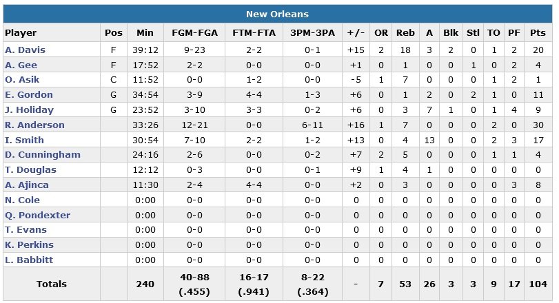 Alors qu’on ne les attendait plus, les Pelicans sont allés chercher leur deuxième victoire de la saison cette nuit face aux Spurs, 104-90. Le trio Anthony Davis (20 points à 9/23, 18 rebonds, 3 passes et 2 contres) – Ryan Anderson (30 points à 12/21 et 6/11 à 3-points et 7 rebonds) – Ish Smith (17 points à 7/10 et 13 passes) a posé de sérieux problèmes à San Antonio, qui restait sur 6 victoires de rang avant ce match.
