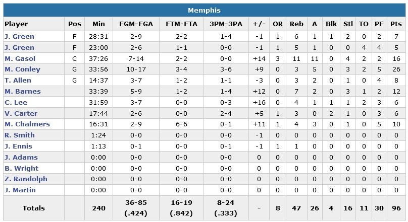 Memphis (devant 59-45 à la pause) creuse le plus gros écart du match en scorant les 6 premiers points de la seconde mi-temps, 65-45. Un 3-points de Marcus Thornton puis un shoot à 6,70m de Ty Lawson (8 points à 2/6 en 16 minutes) en fin de troisième quart-temps réduisent l’écart à 9 points, 79-70. Comme en début de deuxième quart, les Grizzlies démarrent bien les 12 dernières minutes en passant un 6-1 à leurs adversaires pour reprendre 14 points d’avance. Les Rockets rentrent leur premier panier du quart-temps à 3’52 de la fin du match sur un dunk de Terrence Jones.