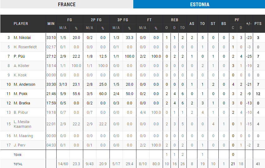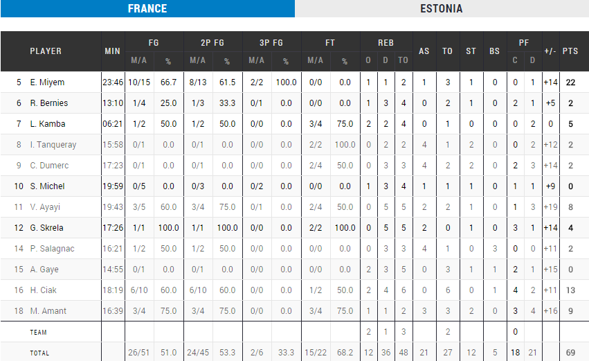 Les filles de Valérie Garnier ont rapidement plié le match en premier quart, remporté sur le score de 23 à 7 dans le sillage d’une Endy Miyem déchaînée en début de rencontre (8 des 10 premiers points). La domination française s’est poursuivie en second quart puisque l’avance est rapidement passée à plus de 20 points grâce à une défense qui a totalement étouffé l’Estonie, limitée à 16 points en première mi-temps pour un score de 43-16. Les bleues ont ensuite tranquillement déroulé après la pause.