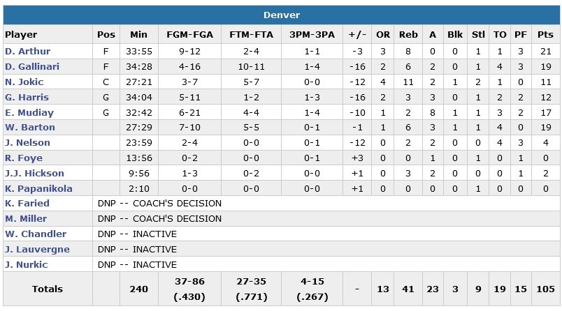 Les Nuggets de Darrell Arthur (21 points) perdent un 3e match de rang et ont joué sans Kenneth Faried, touché à la cheville gauche. Il devaient également faire avec les absences de Joffrey Lauvergne (dos), Jusuf Nurkic (genou). Nikola Jokic termine à 11 points et 11 rebonds.