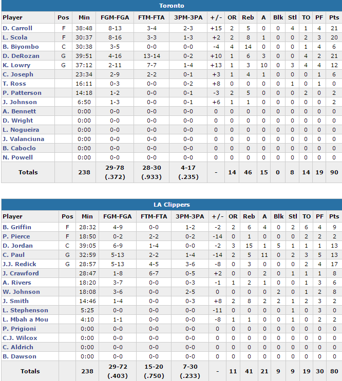 Les Clippers ont touché le fond en première mi-temps, lors de laquelle ils ont compté 29 points de retard. Ils sont revenus en seconde mi-temps mais surtout en profitant d’une adresse catastrophique des Canadiens (limités à 28 points en seconde mi-temps). DeMarre Carroll et DeMar DeRozan terminent avec 21 points et Luis Scola 20. Côté Clippers, limités à 39.7% aux tirs, JJ Redick inscrit 17 points et le trio Chris Paul (13 points), Blake Griffin (9 points) et DeAndre Jordan (13 points), compile seulement 35 points.