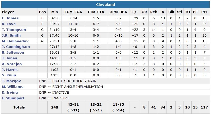 À noter : en l’absence de Mo Williams (cheville droite), Matthew Dellavedova a inscrit 15 points à 5/8 et distribué 9 passes en seulement 23 minutes. Tristan Thompson capte 14 rebonds. Les Cavaliers ont rentré au moins 11 trois-points dans 6 de leurs 7 derniers matchs.