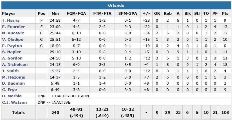 James est au passage devenu le seul joueur de l’histoire avec Oscar Robertson à se classer dans le top 25 de l’histoire au nombre de points et de passes décisives en carrière. Orlando, qui perd son 11e match d’affilée contre Cleveland, termine sans gros scoreur, Scott Skiles ayant décidé d’ouvrir son banc, avec un Andrew Nicholson à 18 points (6/9 et 8 rebonds en 24 minutes) et un Evan Fournier à 13 points (4/5, 23 minutes).