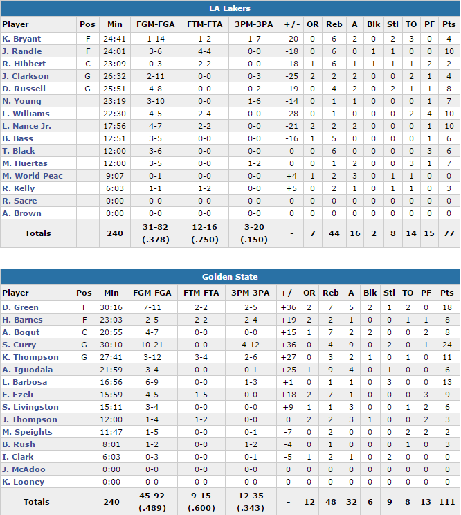 Comme toujours le collectif des Warriors a parlé des deux côtés du terrain et ils n’ont pas eu à forcer leur talent, à l’image de Stephen Curry, tout de même auteur de 24 points à 10/21 dont un 4/12 à trois points et 9 passes en 30 minutes. Draymond Green ajoute lui 18 points à 7/11, 7 rebonds et 5 passes et Leandro Barbosa 13 unités. Golden State a limité les Lakers à 37.8% aux tirs et aucun joueur n’a signé plus de 10 points alors que dans le même temps les Warriors ont shooté à 48.9%, plus maladroits qu’à l’habitude derrière l’arc avec un 12/35, mais ça reste bien mieux que le 3/20 des hommes de Byron Scott.