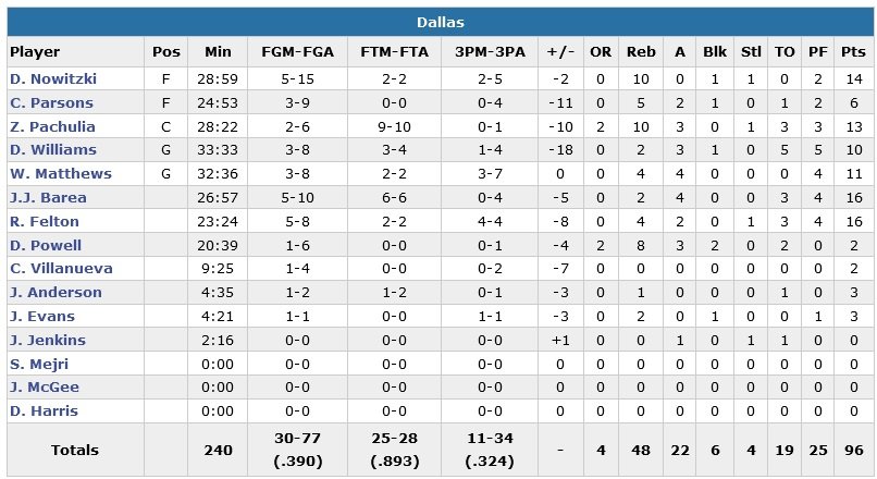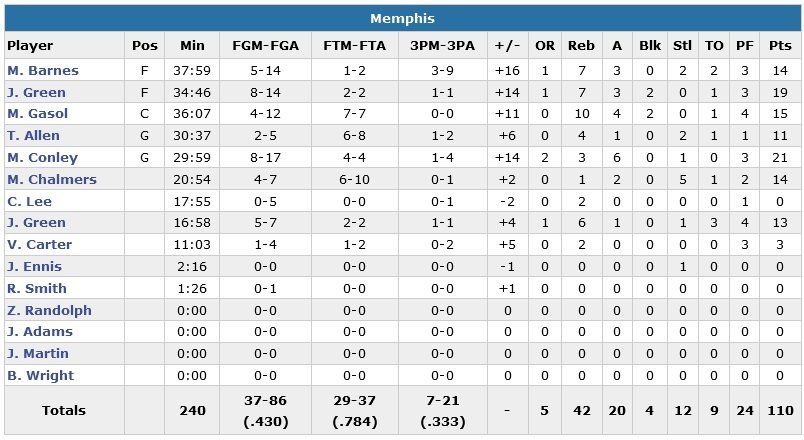 Marc Gasol ajoute 15 points et 10 rebonds, Matt Barnes et Mario Chalmers 14 points et JayMychal Green contribue aussi au scoring avec 13 unités. Raymond Felton et J.J. Barea signent chacun 16 points et ont essayé en vain de ramener Dallas au score dans le 4e quart-temps. Les Mavericks comptent 6 joueurs à au moins 10 points avec un Dirk Nowitzki à 14 points (5/15) et un Zaza Pachulia à 13 points et 10 rebonds.