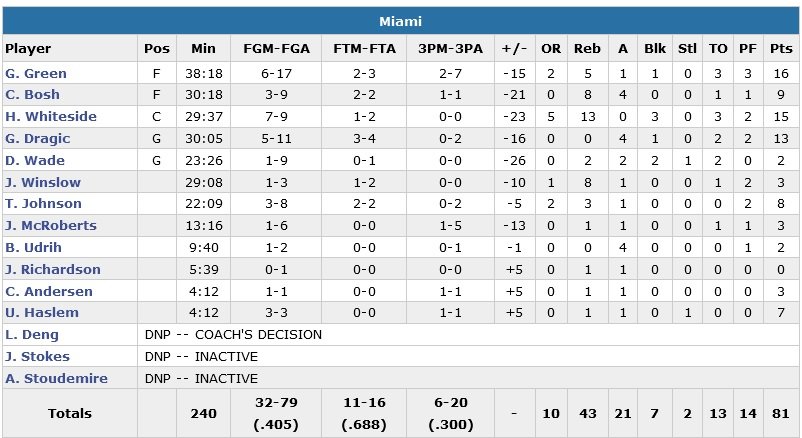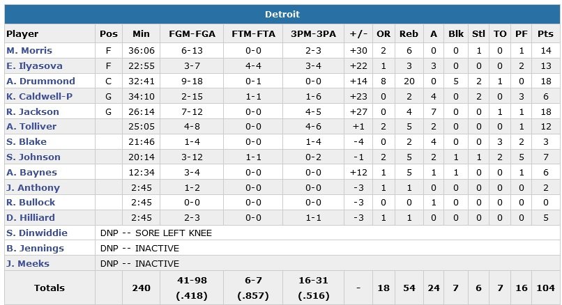 Une 3e victoire en 8 rencontres pour les joueurs de Stan Van Gundy et une 2e défaite en 8 matchs pour ceux d’Erik Spoelstra. Drummond signe là son 4e match de la saison à au moins 20 rebonds. Son homologue Hassan Whiteside termine à 15 points à 7/9, 13 rebonds et 3 contres. Reggie Jackson ajoute 18 points et 7 rebonds pour les Pistons, qui comptent 5 joueurs à minimum 10 points. Dwyane Wade a lui été limité à 2 points à 1/9 en 23 minutes alors que Gerald Green termine meilleur marqueur du Heat avec 16 points.