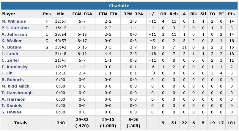 Le collectif des Hornets (6 joueurs à minimum 10 points), porté par les 18 points (6/12), 7 rebonds et 3 passes de Jeremy Lamb et les 16 points (5/15), 7 rebonds et 11 passes de Nicolas Batum, a fonctionné à merveille en fin de match. Charlotte boucle ainsi son match sur un énorme 25-0 pour l’emporter 101-87 face aux Wizards et reste invaincu sur ses 4 derniers matchs, tous joués à domicile.