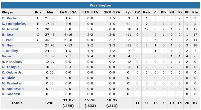 Le banc des Hornets combinent pour un 10/14 aux tirs en première mi-temps, aidant les locaux à mener de 4 points à la pause, 58-54. Tôt dans le match Charlotte domine à l’intérieur (malgré 17 points et 14 rebonds de Marcin Gortat), passant un 30-14 à ses adversaires sur les 24 premières minutes sous le cercle. Washington ne va pas se laisser dicter le match plus longtemps et termine son 3e quart sur un 13-0 pour prendre les rênes 81-74 au terme d’un 27-16 dans la période. Durant ce run, les Hornets sont tenus à 0/5 aux tirs et commettent 5 pertes de balles.