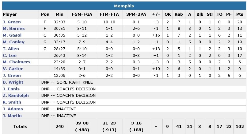 Memphis a fait la course en tête quasiment tout le match malgré l’absence de Zach Randolph pour un 4e match d’affilée (genou droit). James Harden signe lui 40 points à 12/19 (11/11 aux lancers-francs), 5 rebonds et 5 passes alors que Dwight Howard, autorisé à jouer en back-to-back, ne termine qu’à 12 points à 4/8 et 5 rebonds en presque 40 minutes de jeu.