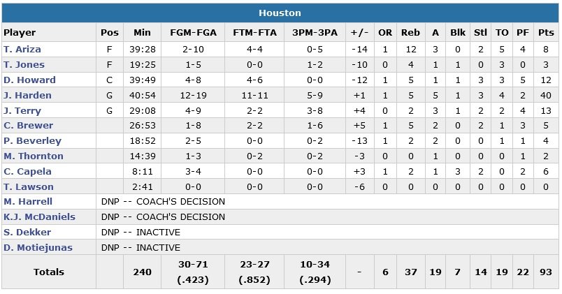 Memphis a fait la course en tête quasiment tout le match malgré l’absence de Zach Randolph pour un 4e match d’affilée (genou droit). James Harden signe lui 40 points à 12/19 (11/11 aux lancers-francs), 5 rebonds et 5 passes alors que Dwight Howard, autorisé à jouer en back-to-back, ne termine qu’à 12 points à 4/8 et 5 rebonds en presque 40 minutes de jeu.