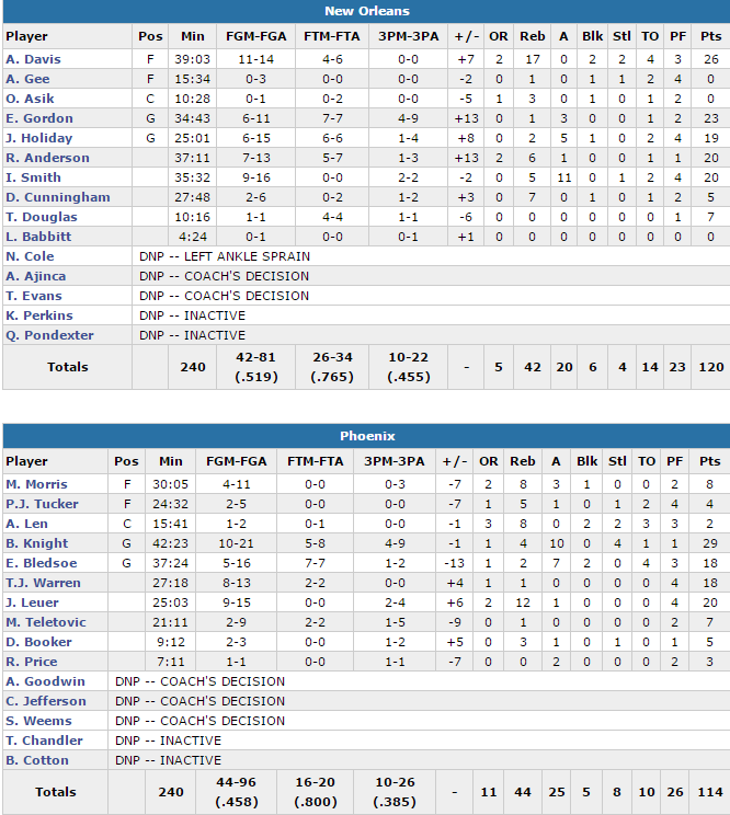 Menés par Brandon Knight (29 points à 10/21 et 10 passes), Eric Bledsoe (18 points) et les remplaçants TJ Warren (18 points) et le surprenant Jon Leuer (20 points dont 13 en dernier quart, 12 rebonds), les Suns ont démarré très fort le match 9-0 puis 22-12 et finalement 39-25 après 12 minutes. Bledsoe a porté cette avance à 17 points en début de second quart, mais les Pelicans n’ont pas paniqué et ont refait petit à petit leur retard. Sur un 13-4 pour finir la mi-temps ils ont recollé à 60-58. Les débats se sont équilibrés au retour des vestiaires et les Pelicans ont pris pour la première fois les commandes (ils ont réussi leurs 6 premiers tirs du troisième quart) et sur une grosse fin de quart du duo Smith – Anderson ils se sont retrouvés devant pour entamer les 12 dernières minutes, 88-85.