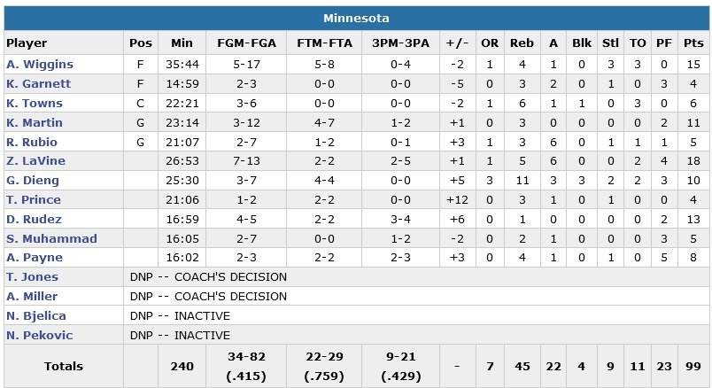 Classés derniers de la ligue en pourcentage de réussite à 3-points avant ce match, les Wolves terminent à 9/21 derrière la ligne. Andrew Wiggins apporte 15 point à 5/17 alors qu’en face, les Hawks (5e défaite en 7 matchs) de Paul Millsap (22 points et 10 rebonds) et Jeff Teague (22 points, 5 rebonds, 5 passes) ne shootent qu’à 37.8% et 25% à 3-points. Damjan Rudez ajoute 13 points à 3/4 à 3-points et Gorgui Dieng 10 points et 10 rebonds pour les Wolves.