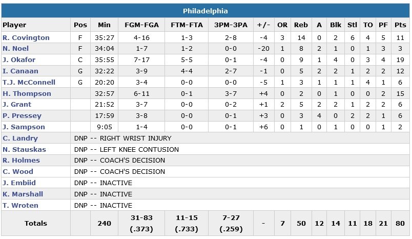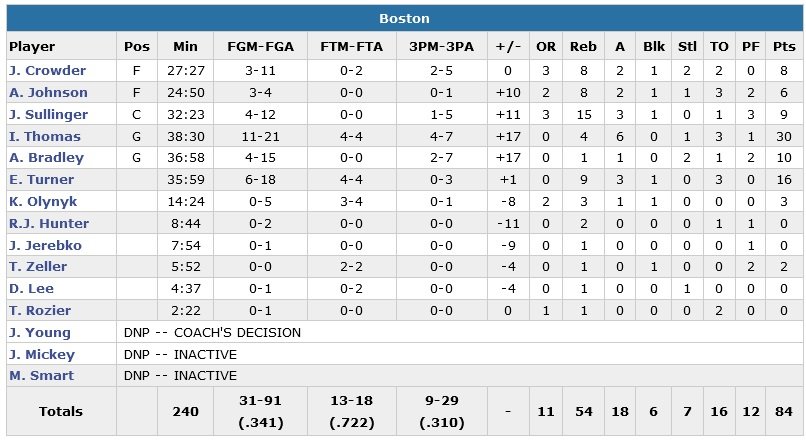 Evan Turner ajoute 16 points pour Boston, encore mené de 5 points à 3 minutes de la fin du match. Seulement Philadelphie ne marque que 3 points dans les dernières 6’13. Difficile dans ces conditions d’aller chercher la victoire. Jahlil Okafor signe 19 points et 9 rebonds, Hollis Thompson 15 points. Les 76ers passent un 10-0 (7 points de Robert Covington) à leurs adversaires en ouverture du deuxième quart-temps et prennent jusqu’à 8 points d’avance. Les fans commencent à faire part de leur mécontentement sur un 3-points de Thompson qui porte le score à 68-59 en faveur des visiteurs à 9’40 du buzzer final. L’écart passe à 11 points en début de 4e quart-temps et restera le même avant qu’il reste 6 minutes à jouer.