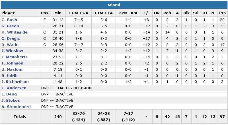 Carmelo Anthony (11 points à 4/13 et 3 rebonds) est chaud dans le premier quart (11 points à 4/5) mais ne va tout simplement plus marquer un seul point après ce dernier. Miami en profite pour revenir à un point et prendre le contrôle par sa défense. Les Knicks ne trouvent que 3 paniers en plus de 7 minutes durant le troisième quart et leurs adversaires sont devant 73-64 avant de jouer les 12 dernières minutes de la rencontre.