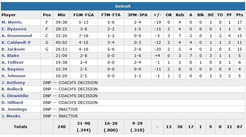 OKC marque les 8 premiers points du match mais ce sont les Pistons qui font la course en tête à la mi-temps, 55-48. Detroit shoote à 46% sur les deux premiers quarts et réussit à tenir le duo Durant – Westbrook à un petit 7/20 aux tirs. Mais la disette ne va pas durer pour les locaux, relancés par deux 3-points de Durant, 62-60, dans le troisième quart.