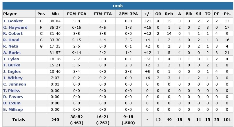 Ce dernier était loin d’être seul puisque Gordon Hayward ajoute 17 points, Rodney Hood 16. Trevor Booker est lui en double-double (le premier de sa saison) avec 13 points et 15 rebonds alors que Rudy Gobert signe 9 points, 14 rebonds et 4 contres. Touché au genou la veille contre les Clippers (défaite 111-90), Anthony Davis a finalement tenu sa place sans problème et a été intenable avec 14 des 16 premiers points des Pelicans (dominés 49-35 au rebond) dans le premier quart-temps pour un total de 36 unités à 12/18, 11 rebonds et 3 contres.
