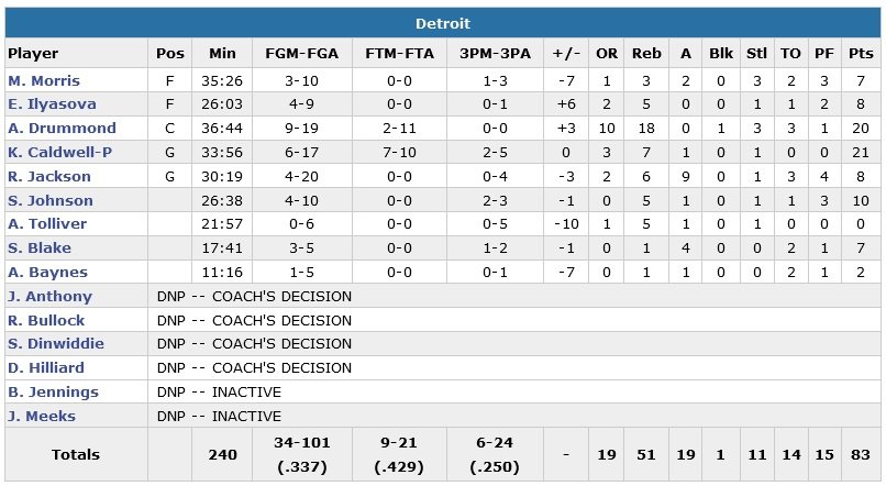 Wayne Ellington ajoute 12 points (record en saison) alors qu’en face, Andre Drummond a enregistré son 15e double-double (1er de la ligue) avec 20 points et 18 rebonds. Kentavious Caldwell-Pope inscrit 21 points et prend 7 rebonds mais Detroit (33.7% aux tirs contre 43.2% pour les Nets) passe en négatif avec une 9e défaite en 17 rencontres.