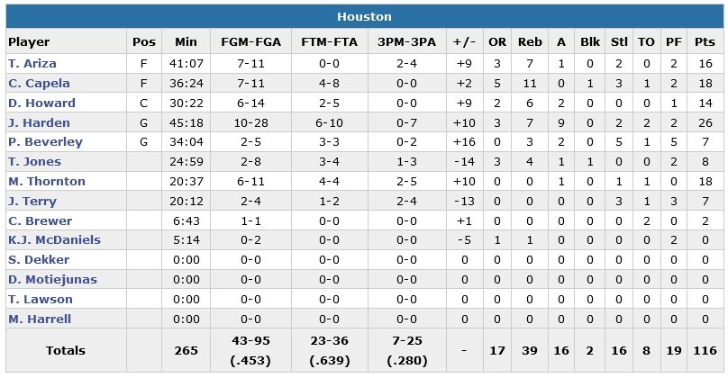 À noter : les Rockets ont inscrit les 4 premiers points du match mais n’ont ensuite plus mené au score avant la prolongation. Kevin Seraphin joue presque 32 minutes pour 14 points à 7/10, 7 rebonds, 4 passes et 4 contres.