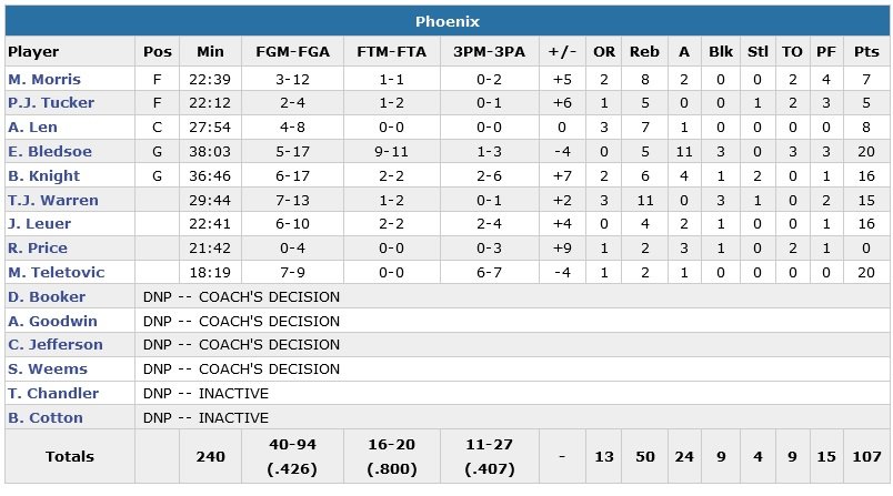 Brandon Knight et Jon Leuer ajoutent 16 points, T.J. Warren 15. Fraîchement revenus d’une victoire à Washington, les Raptors sont menés par les 29 points (record en saison) de DeMar DeRozan (11/20, 3 rebonds, 7 passes) et les 20 points à 8/13 de DeMarre Carroll. Les Suns ont su matché l’adresse de leurs adversaires à 3-points (11/27 pour Phoenix et 12/29 pour Toronto) tout en dominant le rebond (50-43).