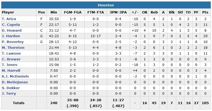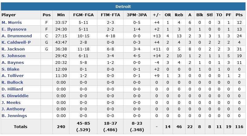 Detroit prend jusqu’à 23 points d’avance en première mi-temps, période durant laquelle Houston shoote à 31% et ne délivre que 4 passes sur 50 possessions, laissant au passage les Pistons shooter à 55%. Les Rockets reviendront dans le match en envoyant constamment Drummond aux lancers-francs (4/18) mais ne sont néanmoins jamais revenus à une possession. James Harden termine à 29 points à 6/15, 9 rebonds et 7 passes alors qu’en face, le duo Jackson – Drummond reçoit l’aide précieuse du rookie Stanley Johnson, qui signe 19 points et 10 rebonds.
