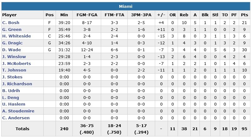 Jared Sullinger ajoute 17 points (7/10, 6 rebs) et les 5 titulaires de l’équipe visiteuse terminent tous à minimum 10 points. Mené de 14 points, le Heat réduit l’écart à un point dans le 4e quart-temps mais n’aura jamais mené au score après la mi-temps. Chris Bosh a joué malade (21 points à 8/17, 10 rebs, 5 passes). Son équipe réduit l’écart à une possession à 5 occasions dans les 14 dernières minutes. Boston a su répondre à chaque fois.